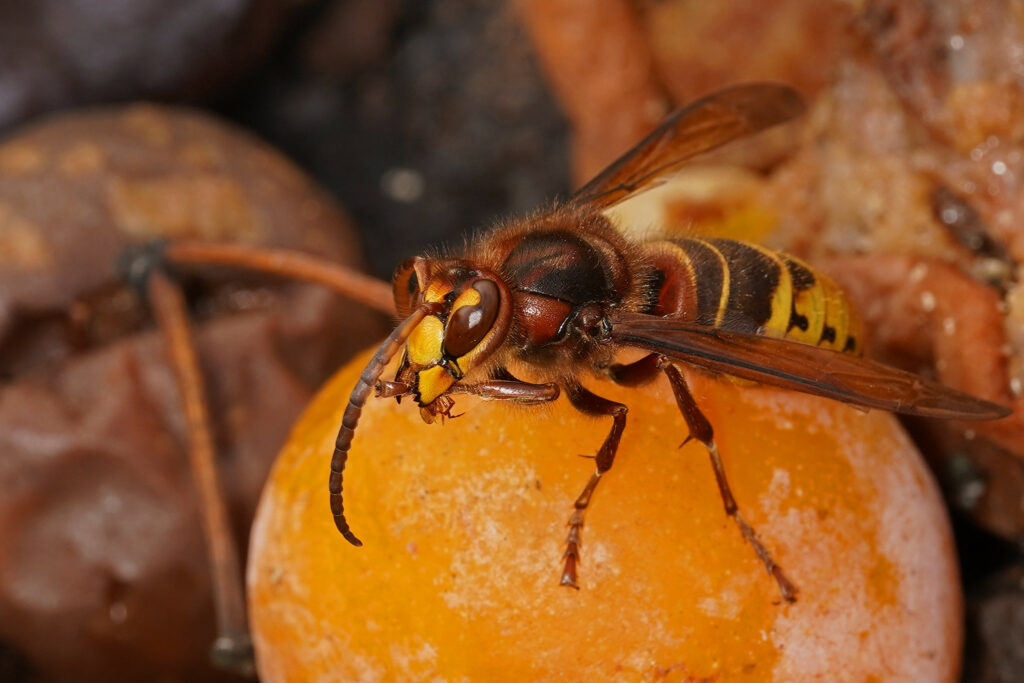 Frelon qui vient prendre sa part de jus de poire à la coupelle des papillons.