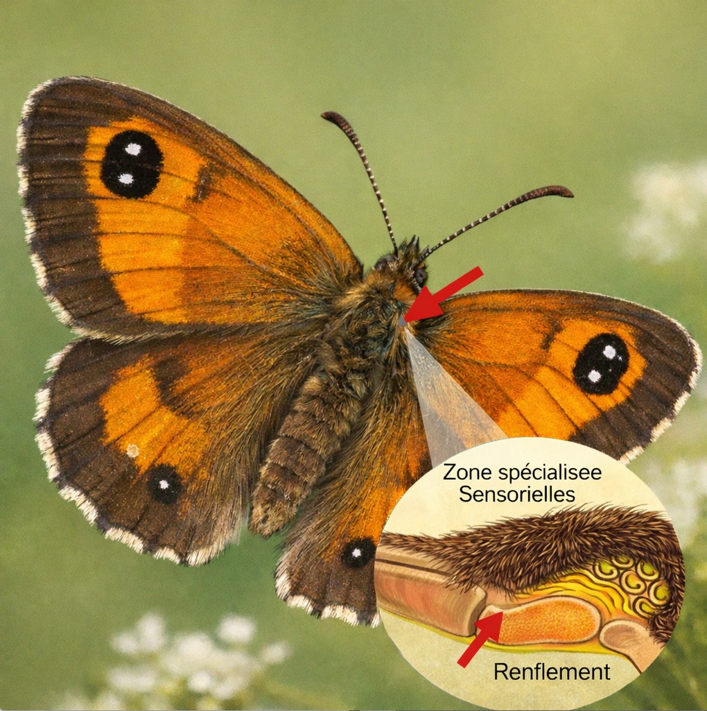 A la base de la nervure costale de l’aile antérieure, on observe un léger renflement correspondant à une zone spécialisée associée à des structures sensorielles, impliquées notamment dans la perception des vibrations et les interactions liées au vol.