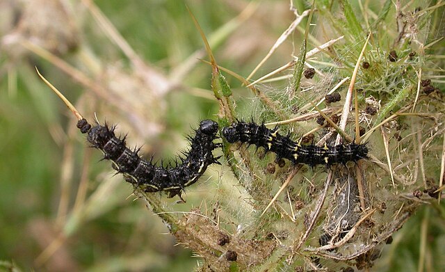 Sa tête est pourvue de mandibules puissantes pour le broyage des feuilles coriaces des chardons. Sur sa partie ventrale, elle possède trois paires de pattes véritables à l’avant. Elle a également quatre paires de fausses pattes membraneuses munies de crochets, ainsi qu’une paire à l’arrière. Cet ensemble lui permet une adhésion forte au revers des feuilles, même dans les milieux ventés comme la steppe marocaine.