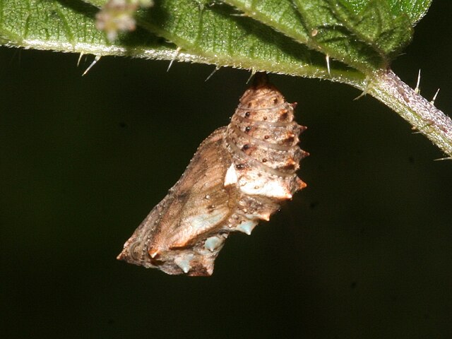 La chrysalide possède une coloration variable, allant du brun clair au gris jaunâtre, ce qui lui permet de se confondre avec les tiges ou les feuilles sèches. Elle présente des petites pointes sur le dos et deux cornes sur la tête. On observe également des taches métalliques dorées ou argentées sur sa face dorsale.