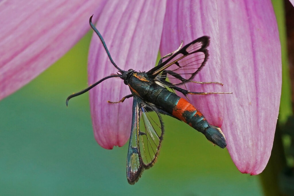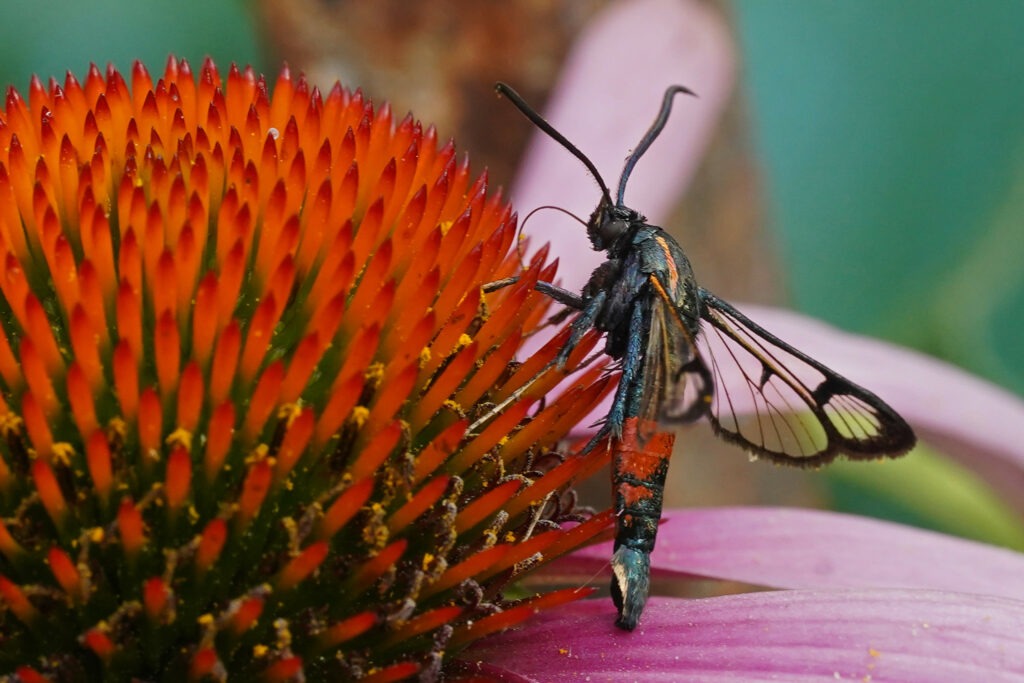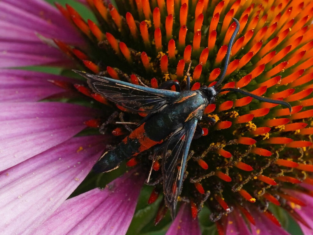 La Sésie du néflier fait partie des papillons de petite taille puisqu’elle peut atteindre 20 à 25 mm d’envergure. Celle-ci a passé de longs moments à butiner les échinacées du jardin, profitant du plein soleil pour s’activer.