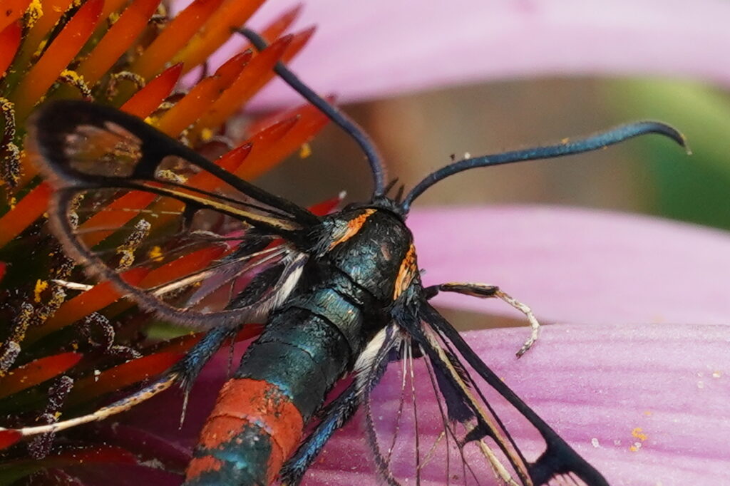 Sésie du néflier en train de butiner une Echinacea purpurea.