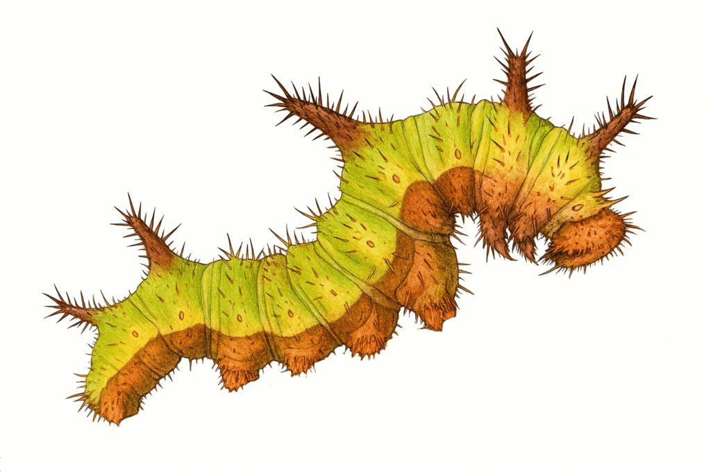 À l’éclosion, la jeune chenille consomme une partie du limbe mais conserve la nervure centrale. Elle se tient sur ce support étroit, où elle fixe parfois de petits débris végétaux pour améliorer son camouflage. Les jeunes chenilles ont une apparence brunâtre et irrégulière qui évoque une petite fiente d’oiseau. Ce mimétisme constitue une stratégie de protection efficace contre de nombreux prédateurs.