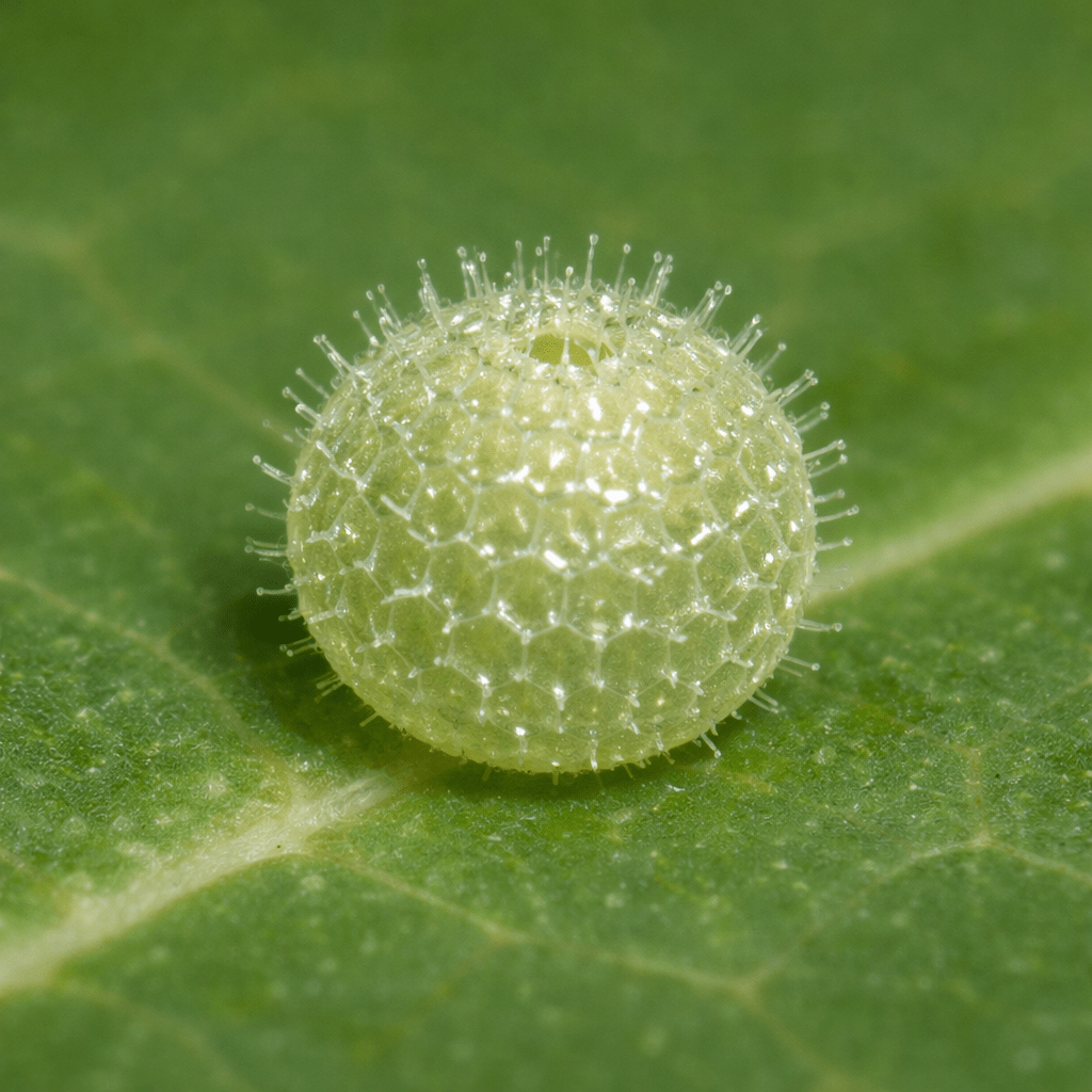 Elle dépose ses œufs isolément sur le bord du limbe des feuilles. L’œuf est de forme globuleuse, légèrement aplatie, et présente une surface finement réticulée formant un réseau de petites cellules. Sa coloration verdâtre le rend peu visible sur la feuille.