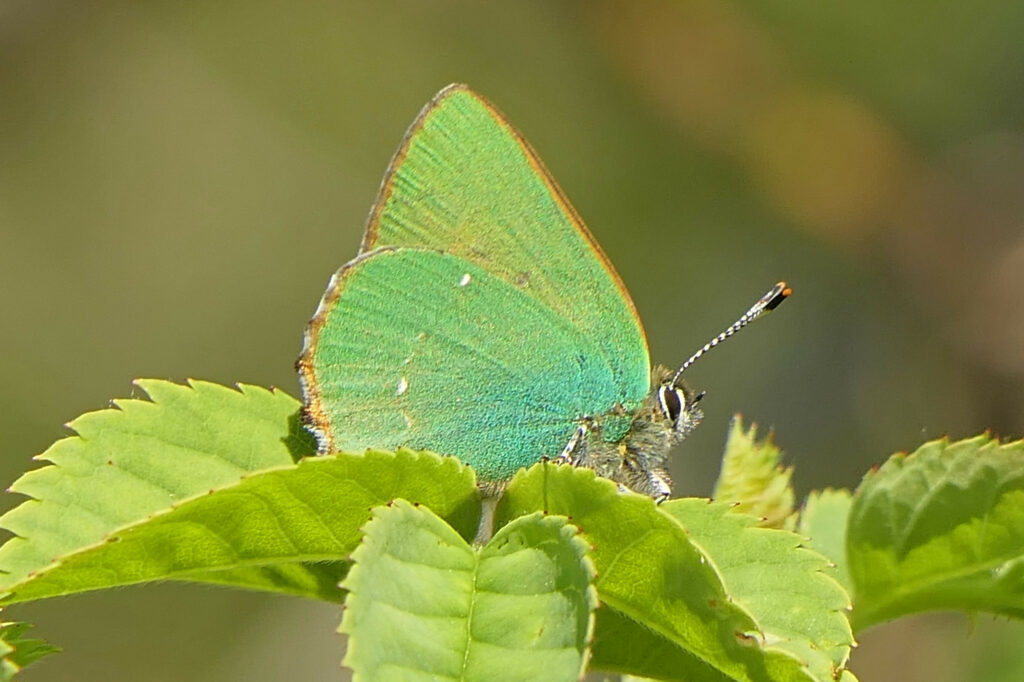 Le revers des ailes constitue le critère d’identification le plus fiable et le plus spectaculaire. Il offre une coloration vert émeraude dont l’aspect satiné peut virer au grisâtre chez les individus en fin de vie. Sur les ailes postérieures, on distingue souvent une ligne transversale composée de petits points blancs plus ou moins alignés, parfois réduits à de simples traces punctiformes. La bordure externe des ailes est soulignée par une frange brune et blanche alternée, créant un liseré discret. Cette coloration verte, unique chez nos papillons de jour, résulte d’une structure microscopique des écailles qui diffracte la lumière, permettant à l’insecte de simuler parfaitement la teinte des jeunes pousses de ronce pour échapper à la vue des prédateurs.