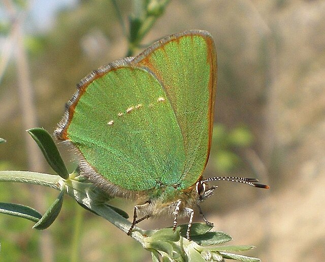 Il appartient au genre Callophrys, qui regroupe des papillons dont la face inférieure des ailes est uniformément verte. La particularité majeure de ce genre est l’absence de queues sur les ailes postérieures, contrairement à d’autres genres de la même famille. Cette coloration verte n’est pas due à des pigments, mais à une structure microscopique des écailles qui diffracte la lumière. Cet insecte pratique l’homochromie, ce qui signifie que sa couleur lui permet de se confondre parfaitement avec le feuillage des arbustes lorsqu’il est au repos, les ailes repliées.
