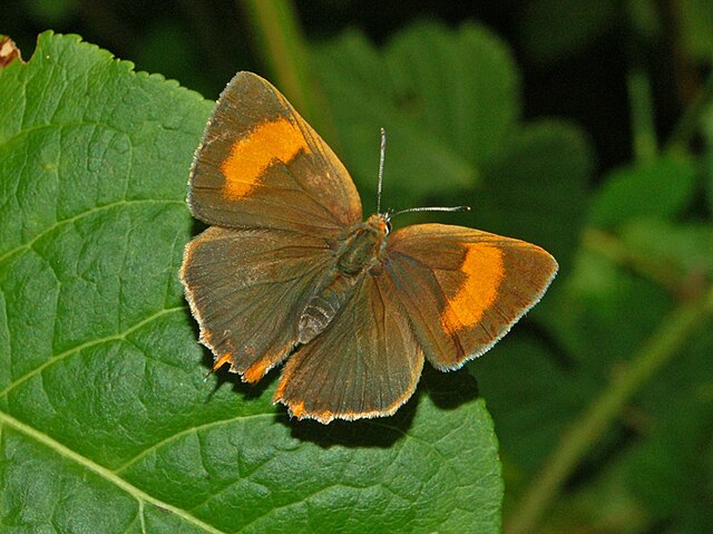 Le dessus des ailes est d’un brun sombre et profond chez les deux sexes. Cependant, cette espèce présente un dimorphisme sexuel marqué : la femelle arbore sur ses ailes antérieures une large tache réniforme d’un orange vif, tandis que le mâle ne possède qu’une marque plus discrète et pâle, voire inexistante. Les ailes postérieures se terminent par de petites extensions filiformes, appelées queues, situées au niveau de l’angle anal. Ces appendices sont de couleur orange et prolongent les nervures de l’aile.