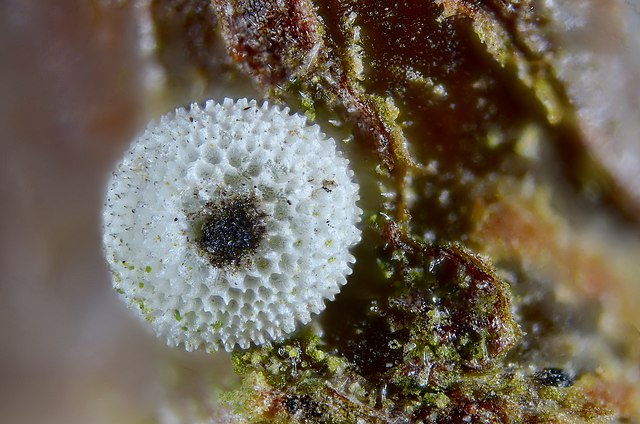 Sa forme peut rappeler celle d’un tout petit oursin. Sa coloration est d’un blanc pur et éclatant qui le rend particulièrement repérable sur l’écorce sombre des prunelliers durant l’hiver. La surface n’est pas lisse mais présente une texture alvéolée assez sophistiquée. Elle est recouverte d’un réseau de crêtes saillantes qui délimitent de nombreuses petites cavités polygonales, donnant à l’ensemble un aspect réticulé. Au sommet de ce dôme se trouve une dépression centrale plus sombre, le micropyle, par lequel s’effectuent les échanges gazeux et la fécondation. Cette enveloppe protectrice est extrêmement robuste, car elle doit isoler l’embryon des variations thermiques et de la dessiccation pendant les longs mois d’hiver.