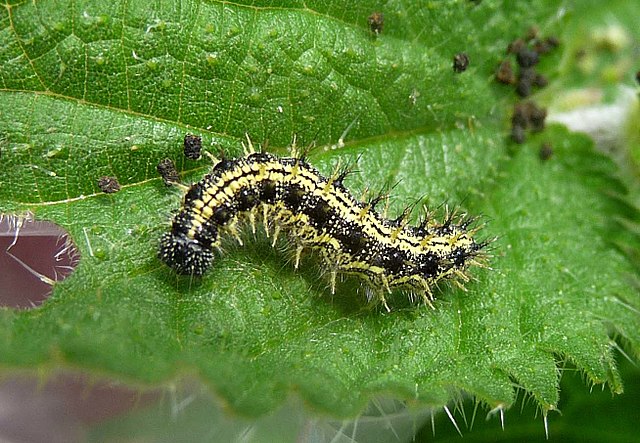 On observe deux lignes longitudinales d’un jaune vif qui parcourent ses flancs. Ces bandes contrastées servent de signal d’avertissement pour les prédateurs. Le dos et les côtés sont hérissés de nombreuses épines ramifiées, appelées scoli. Ces pointes noires ne sont pas urticantes pour l’homme, mais elles découragent les oiseaux et les petits mammifères. La tête est entièrement noire et très dure, adaptée au broyage incessant des feuilles d’ortie.