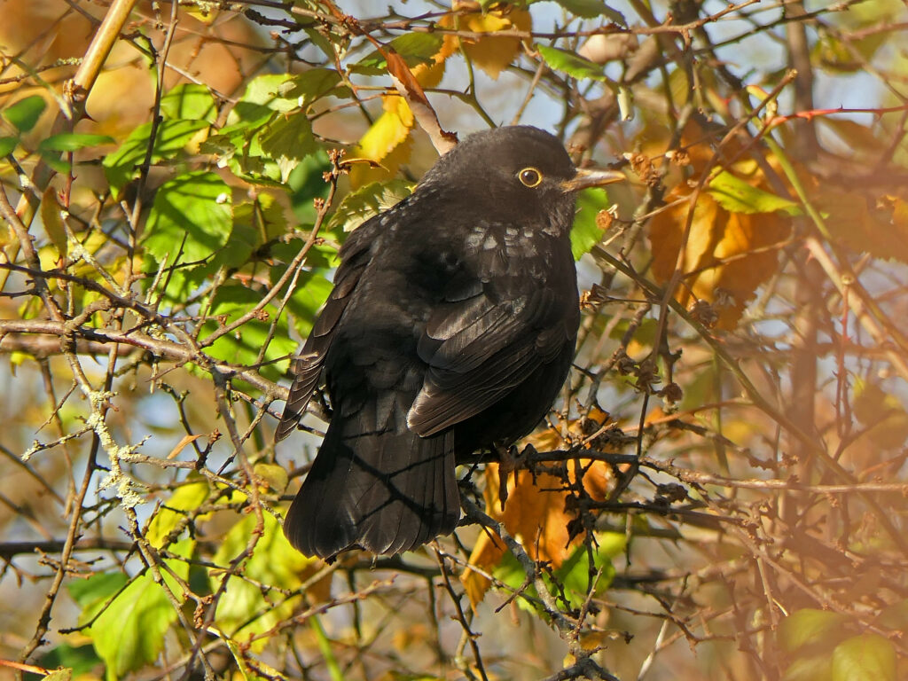 C’est un oiseau qui est présent partout, aussi bien à la campagne qu’en ville où il s’est très bien adapté. Le mâle peut être décrit en peu de mots . il est entièrement noir avec un bec jaune orangé et un anneau orbital de la même couleur autour de l’œil. L’iris est marron et les pattes sont rougeâtres avec des pointes de violet.