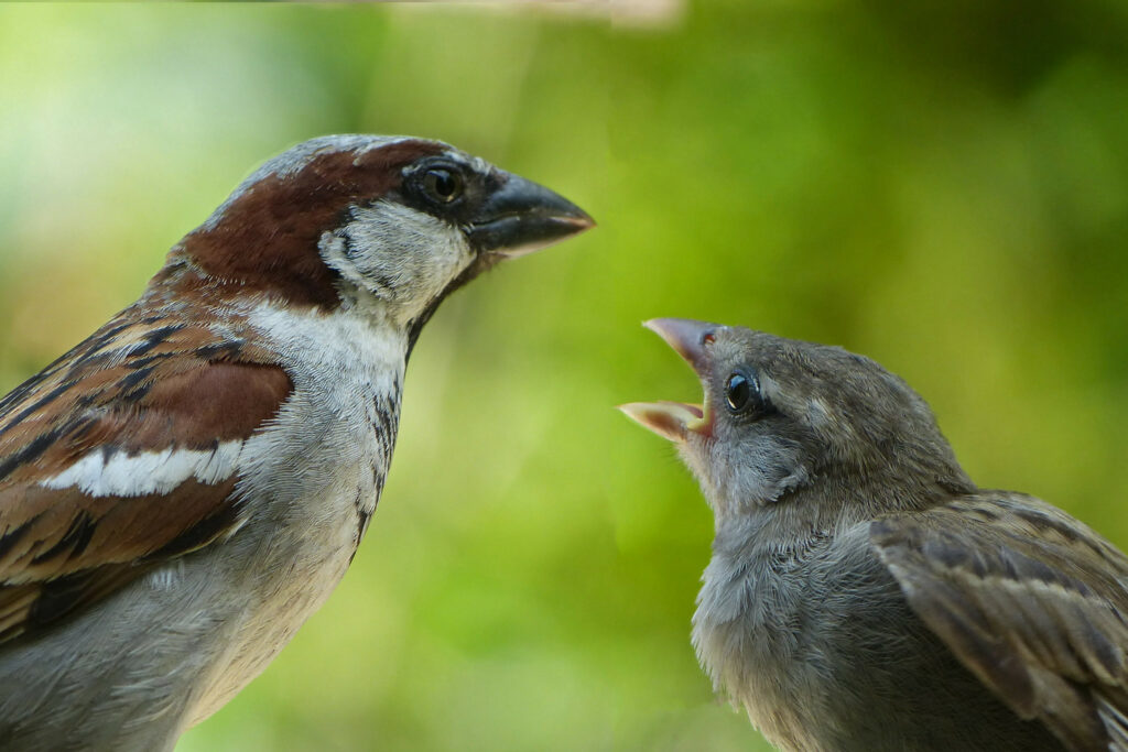 On sait par ailleurs que les mâles comme les femelles peuvent avoir des relations avec un ou plusieurs partenaires durant la même période. Des analyses génétiques ont montré que les juvéniles d’une même portée possèdent parfois des pères différents. Les moineaux peuvent faire 3 ou 4 nichées par an lorsque le climat le permet. Dès l’éclosion, les parents apportent presque exclusivement des insectes aux nouveau-nés. Cette nourriture riche en protéines est indispensable pour une croissance rapide. Au bout de deux semaines environ, les jeunes quittent le nid.