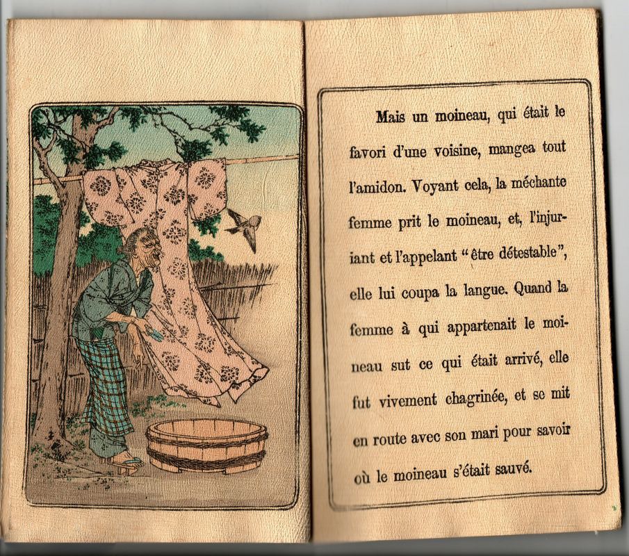 Il était une fois un vieux bûcheron au cœur pur qui vivait avec sa femme, une femme avare et cruelle. Un jour, le vieil homme trouva un petit moineau blessé et l’emmena chez lui pour le soigner. Il le nourrit avec tendresse et l’oiseau devint son plus fidèle compagnon. Cependant, la vieille femme détestait l’animal car elle trouvait qu’il gaspillait la nourriture. Un matin, alors que le vieil homme était en forêt, le moineau mangea un peu de colle d’amidon que la femme avait préparée pour son linge. Furieuse, elle se saisit de l’oiseau et lui coupa la langue avant de le chasser brutalement de la maison.